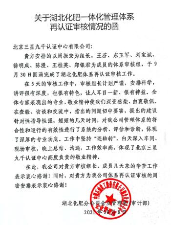 10月8日,公司收到湖北化肥分公司發(fā)來感謝信,對三星九千審核組表現(xiàn)出的專業(yè)、敬業(yè)精神表示衷心感謝?蛻舻恼J(rèn)可是三星九千前進(jìn)的動力。今后三星九千將會一如既往,為湖北化肥做好QESEn管理體系建設(shè)的服務(wù)工作,為湖北化肥對標(biāo)一流化工企業(yè)管理提升貢獻(xiàn)力量。